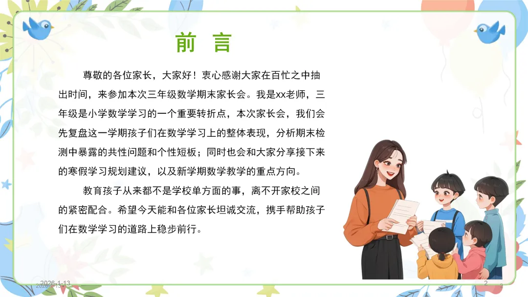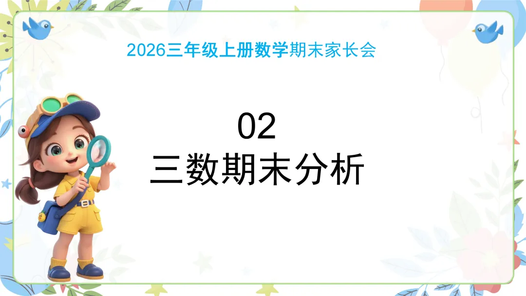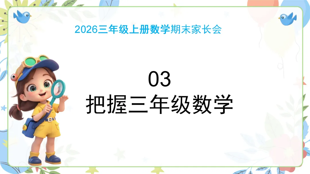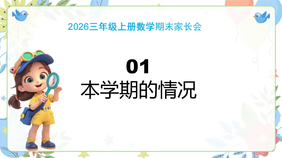 尊敬的各位家长,大家好!衷心感谢大家在百忙之中抽出时间,来参加本次三年级数学期末家长会。我是xx老师,三年级是小学数学学习的一个重要转折点,本次家长会,我们会先复盘这一学期孩子们在数学学习上的整体表现,分析期末检测中暴露的共性问题和个性短板;同时也会和大家分享接下来的寒假学习规划建议,以及新学期数学教学的重点方向。