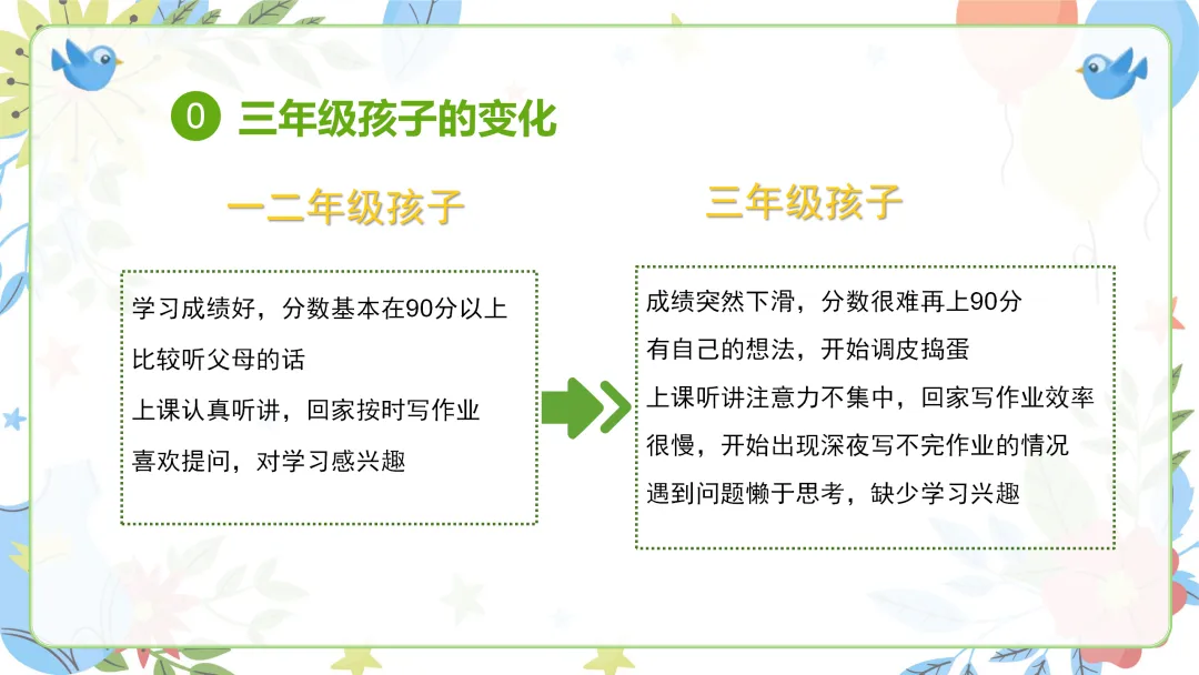 三年级孩子:成绩突然下滑,分数很难再上90分,有自己的想法,开始调皮捣蛋,上课听讲注意力不集中,回家写作业效率很慢,开始出现深夜写不完作业的情况,遇到问题懒于思考,缺少学习兴趣