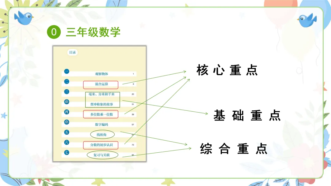 大家看这份目录,三年级数学分别是是核心重点,基础重点跟综合重点,其中运算是特别重要的一个板块
