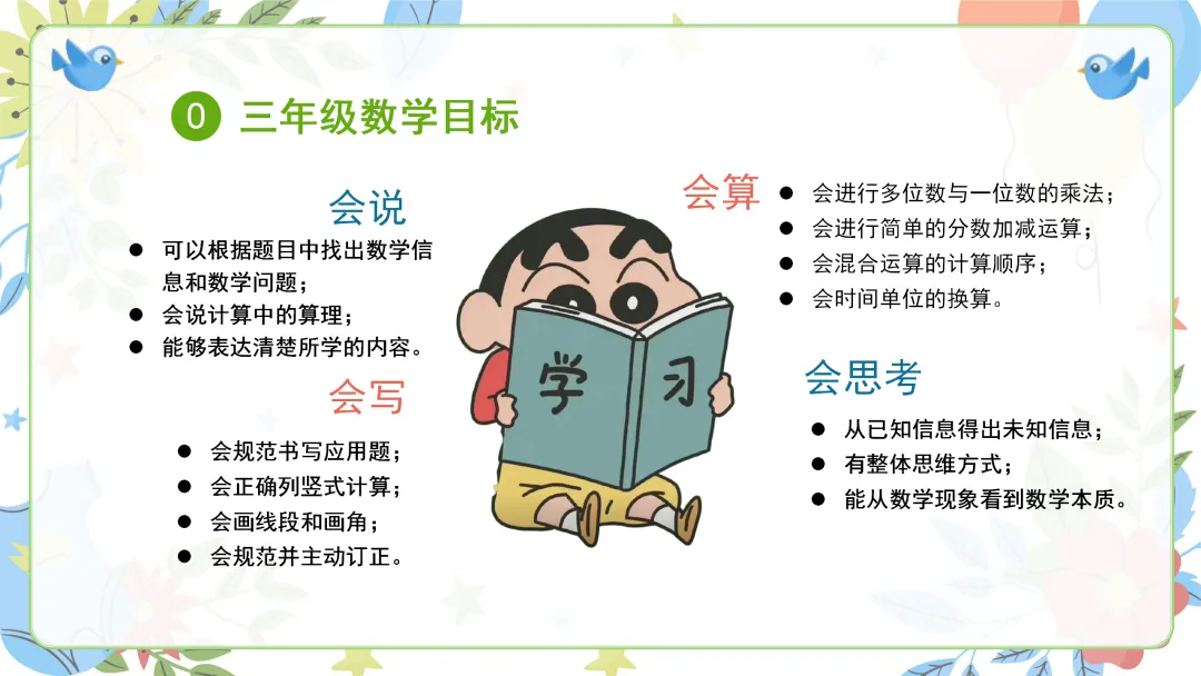 会算:会进行多位数与一位数的乘法;会进行简单的分数加减运算;会混合运算相信我们的孩子