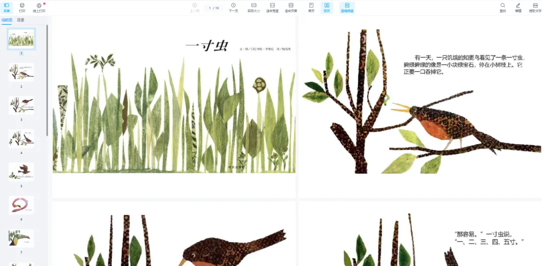 绘本阅读是幼儿教育的重要方式,但许多家长因孩子不识字或价格高而忽视其价值。实际上,绘本通过图文结合能同时刺激儿童的视觉和语言发展。优质绘本能提升儿童的认知、语言和社交能力。长期阅读对学业发展和亲子关系都有积极影响。绘本既是学习工具,也是亲子互动的桥梁。绘本PPT通过丰富多彩的故事和生动的画面,激发幼儿园儿童的学习兴趣,培养他们的阅读能力、想象力和创造力。 绘本PPT电子版画册涵盖了各种主题和风格,包括寓言故事、科普知识、生活常识、人际交往等方面,满足不同年龄段儿童的阅读需求。这些绘本不仅具有丰富的故事情节和精美的插图,还注重文字表达简洁易懂,适合幼儿园儿童阅读和理解。你见过一寸虫吗?它的学名叫尺蠖,豆绿的身体通过蜷缩、伸展的重复动作向前行进,因为行动的时候像人用食指和拇指丈量东西的动作而得名。它是大自然中弱小昆虫的一种,趴在绿色的枝叶上以啃噬叶片为生。但书中的这条“碧绿绿的像是一小块祖母绿宝石”的小虫子,却被作者刻画的迷人又可爱、机智又勇敢。当这只弱小的一寸虫遇到各种各样想要以它为餐的鸟类,结果会怎样呢?这是一个很有意思的绘本,看完后能让我们了解,有很多事情并不是可以用武力就可以解决的,不是因为你长得高,有力气,就可以打败别人,应该多动动脑筋、用智慧来解决问题,这样反而会更成功。就像一寸虫一样,如果我们也遇到了坏人,遇到了困难,就要提醒自己不可以去害怕、紧张,要多动脑筋,用智慧来解决困难,想出解救自己的方法。