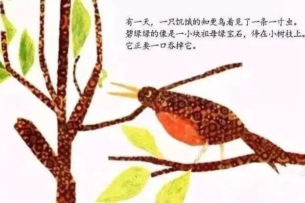 有一天,一只饥饿的知更鸟看见了一条一寸虫。碧绿绿的像是一小块祖母绿宝石,停在小树枝上。它正要一口吞掉它。