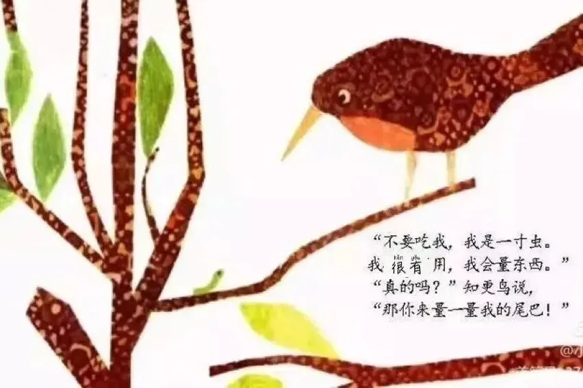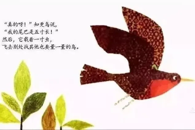 “真的呀!”知更鸟说,“我的尾巴是五寸长!”然后,它载着一寸虫,飞去别处找其他也要量一量的鸟。