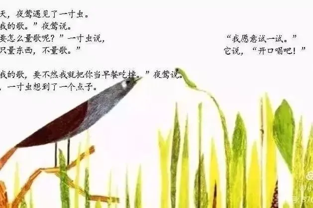 于是,一寸虫想到了一个点子,“我愿意试一试。” 它说,“开口唱吧!”