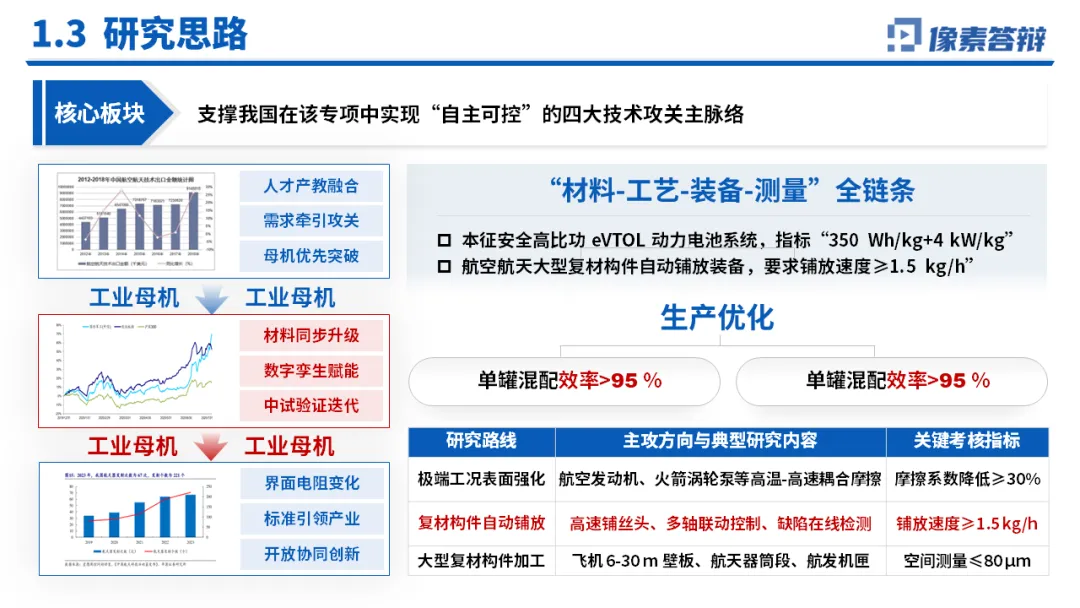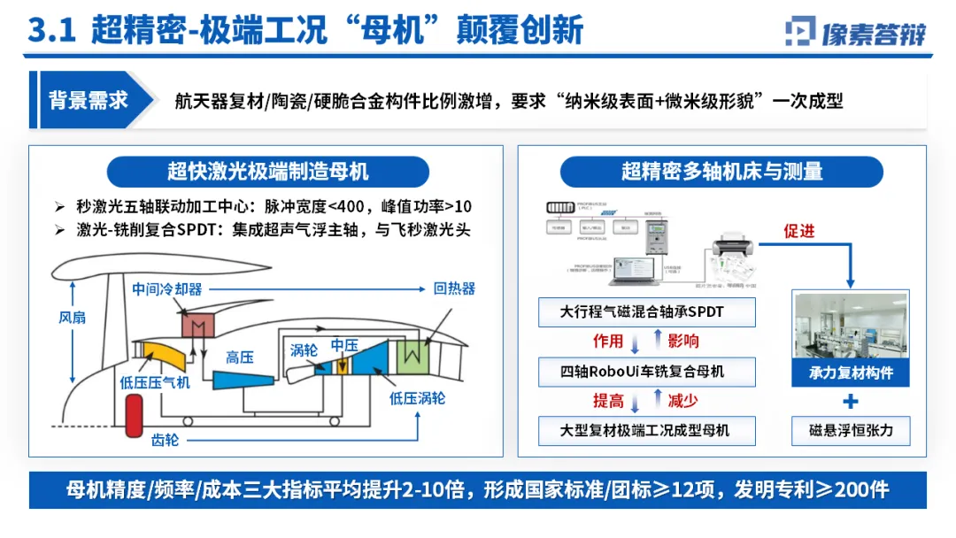 2.板块化呈现核心内容:把研究内容拆分为超精密母机创新、母材原始创新、数字孪生系统创新三大块,每块都包含技术路线、关键指标、应用价值,条理分明不混乱。
