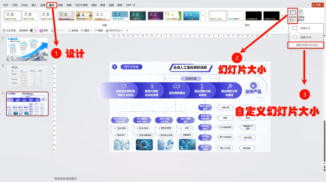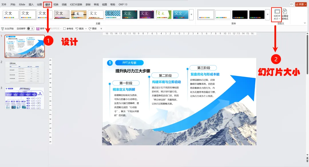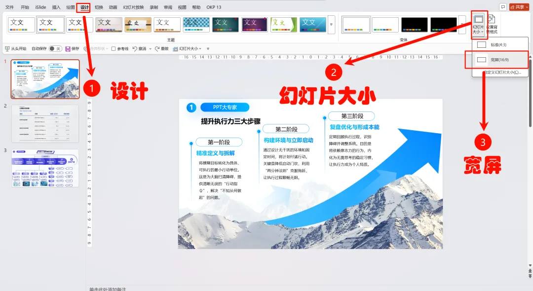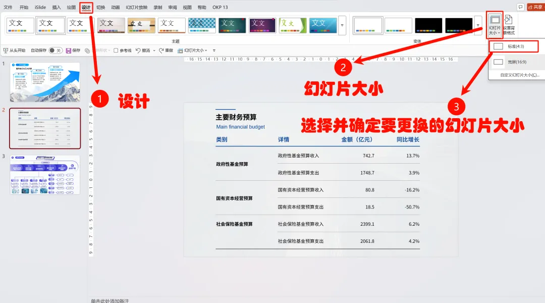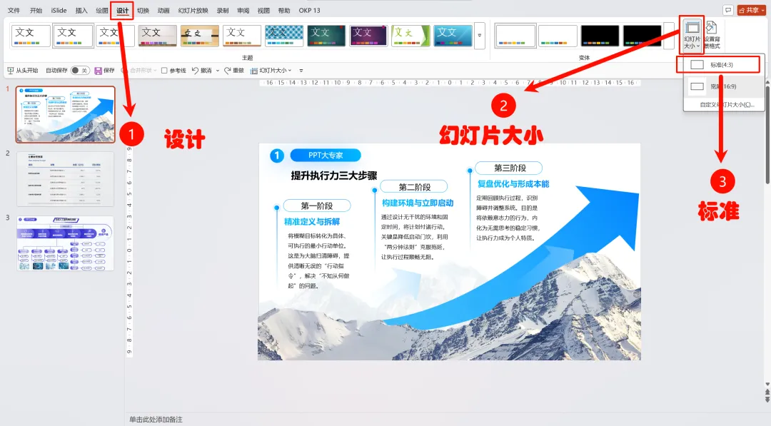 入口:打开PowerPoint → 【设计】选项卡 → 点击【幻灯片大小】按钮重要提醒:一定要在开始制作内容前设置好尺寸! 中途更改会导致所有元素变形或错位。二、两种标准尺寸,对应不同场景