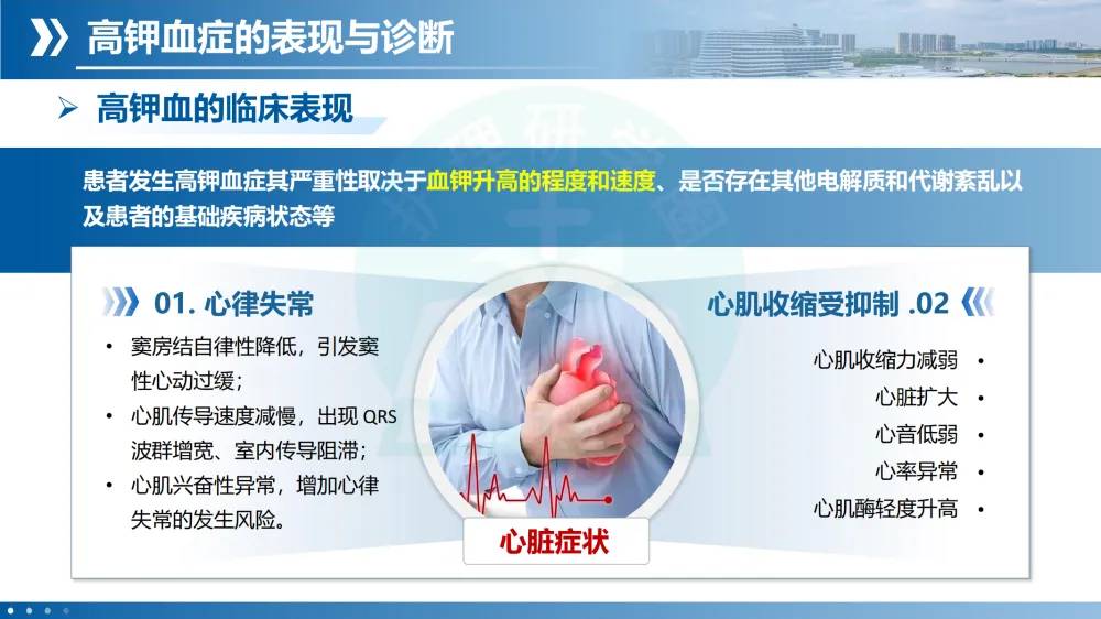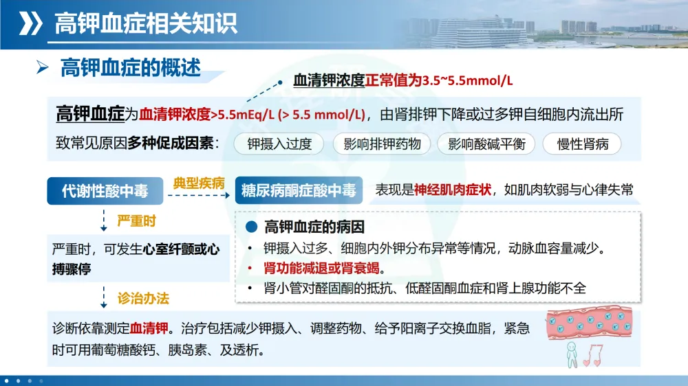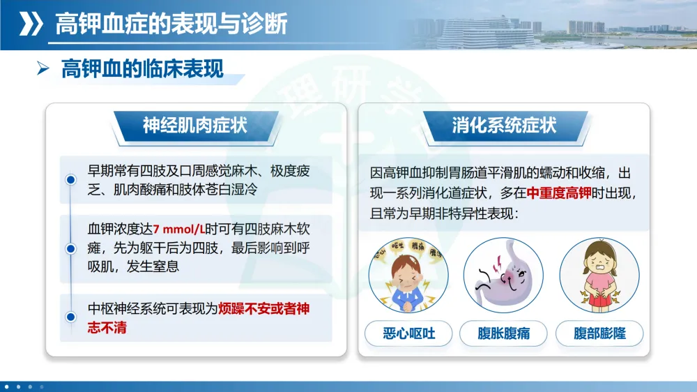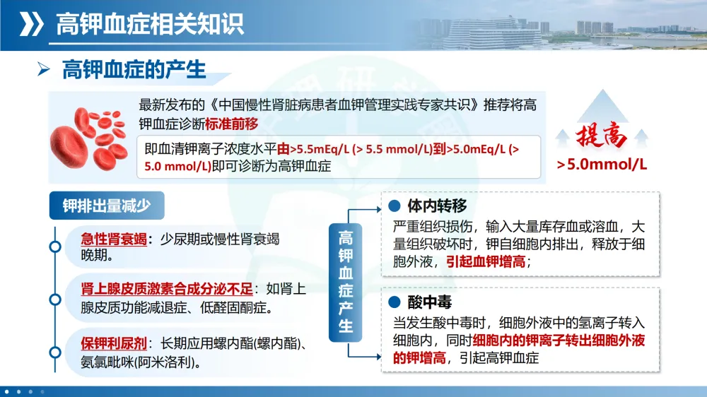 定义与诊断:血清钾 >5.5 mmol/L(传统标准),最新专家共识建议 >5.0 mmol/L 即可诊断。