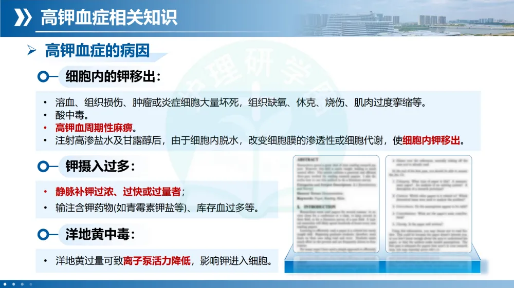 常见病因:钾摄入过多、钾排出减少、细胞内钾外移