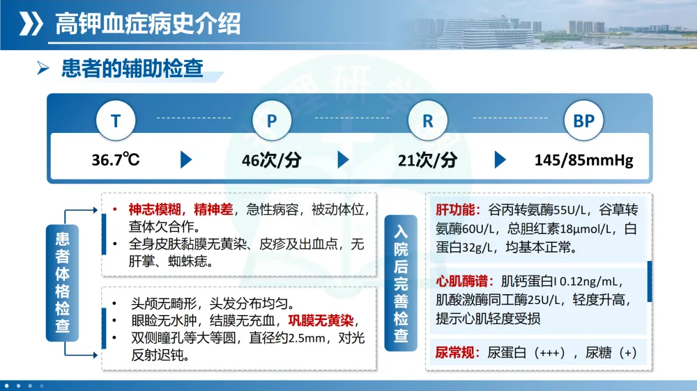 辅助检查:血钾显著升高,具体值未列,但治疗指向高钾。心肌酶轻度升高,提示心肌受损;尿蛋白(+++)。