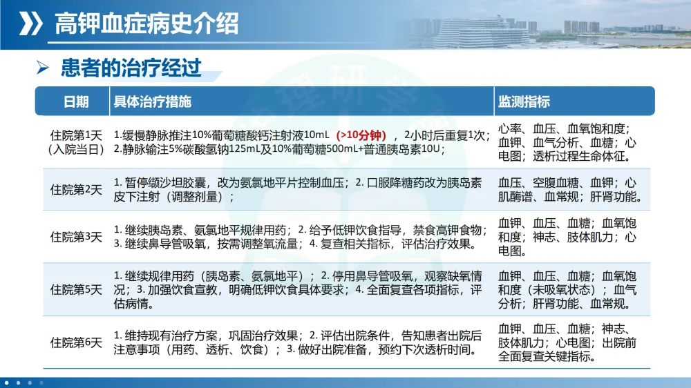 治疗经过:第1天静脉推注葡萄糖酸钙、输注碳酸氢钠+胰岛素葡萄糖液,准备透析。第2-6天调整降压药(停用ARB类),胰岛素强化治疗,低钾饮食指导,逐步停氧并复查指标。