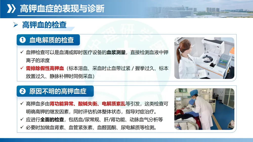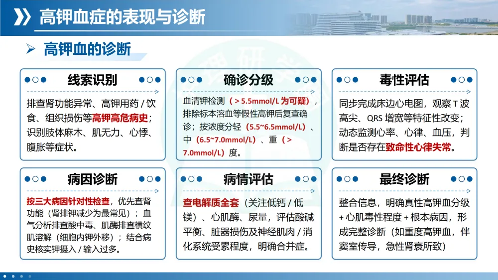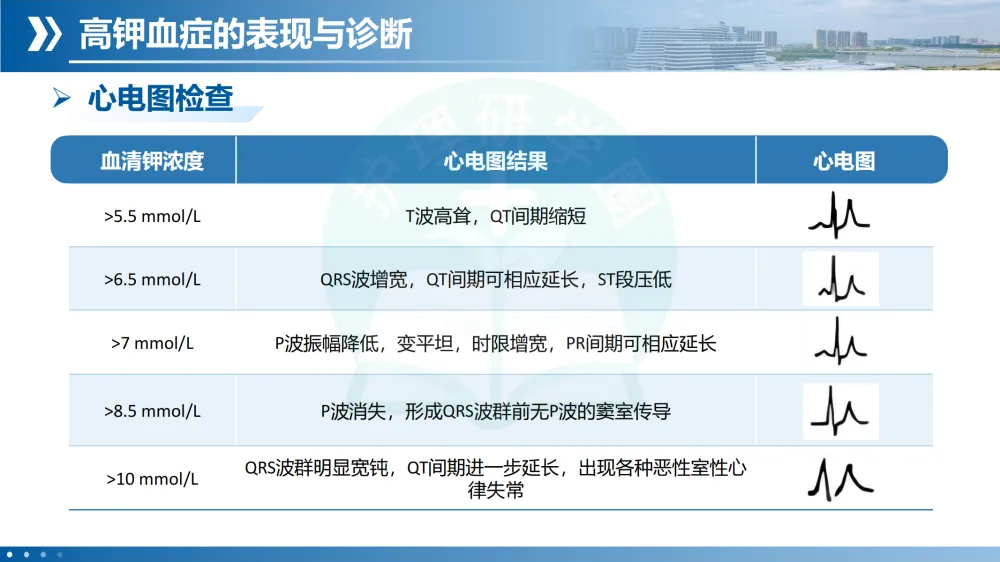 诊断步骤:血钾检测排除假性高钾。心电图特征性改变随血钾升高而进展(T波高尖→QRS增宽→P波消失→室性心律失常)。病因排查重点评估📖肾功能、酸碱平衡、药物史、摄入史。分级轻度、中度、重度。