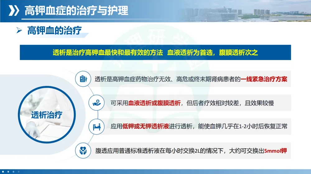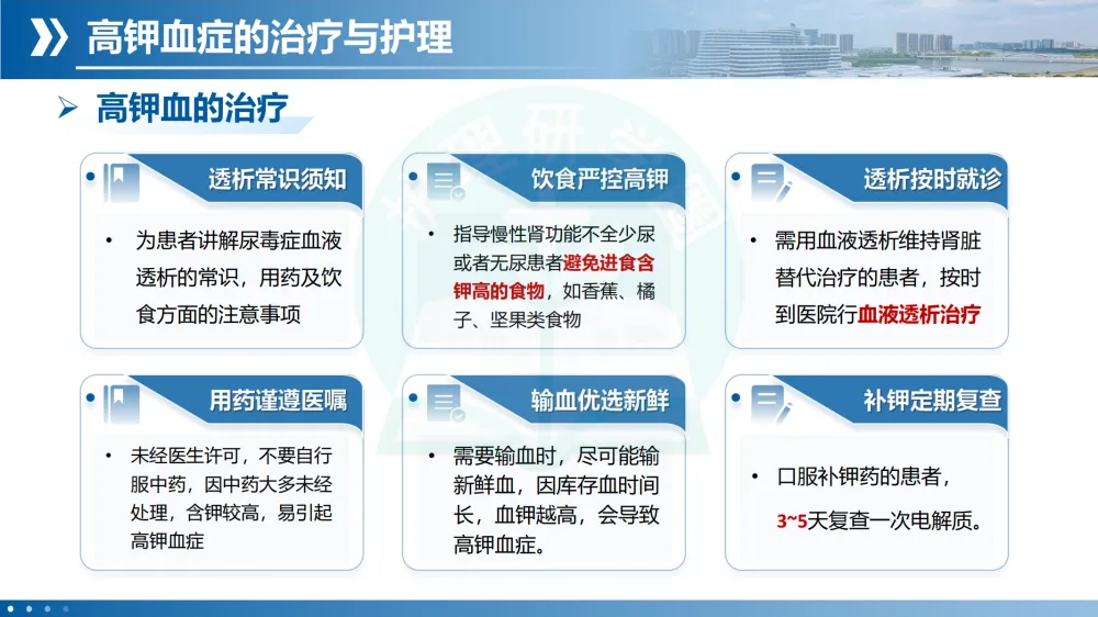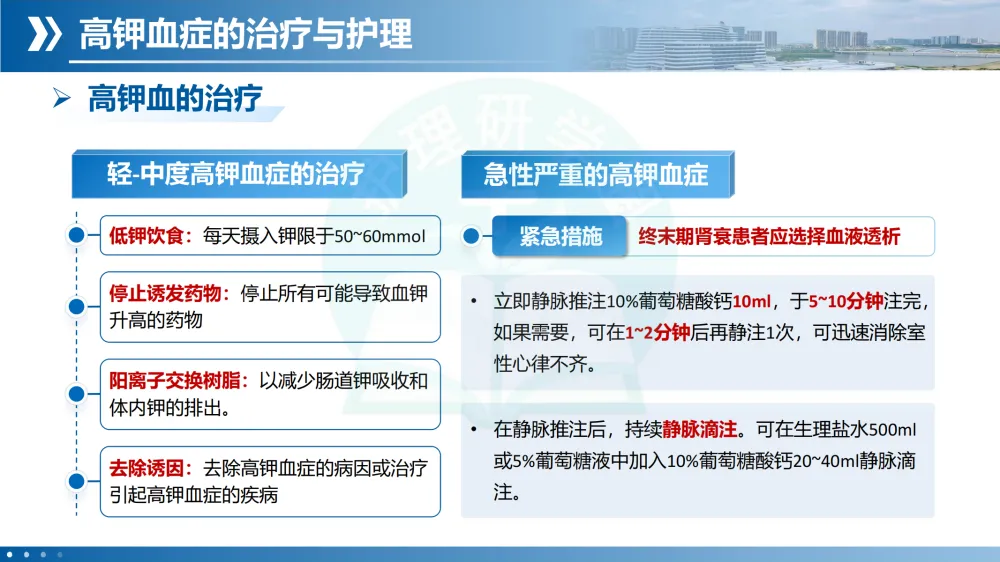 紧急处理:长期管理低钾饮食🥗、停用保钾药物、纠正原发病。拮抗心肌毒性10%葡萄糖酸钙静推。促钾向细胞内转移胰岛素➕葡萄糖、碳酸氢钠。促钾排出如利尿剂、阳离子交换树脂。透析最快最有效,尤其用于终末期肾病患者。