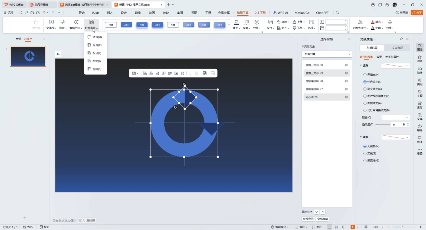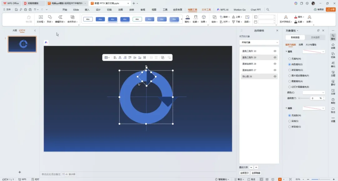 ①插入一个圆环形状,设置无边框颜色,插入两条直线,将他们垂直相交,将圆环平均分为四份。然后再插入两个直角三角形,如视频摆放。