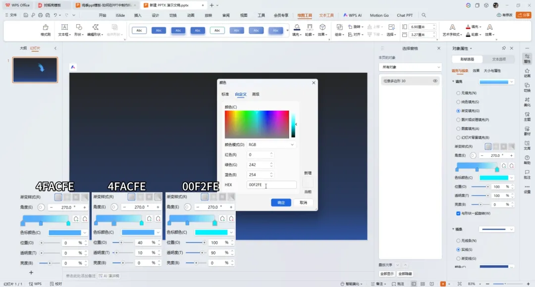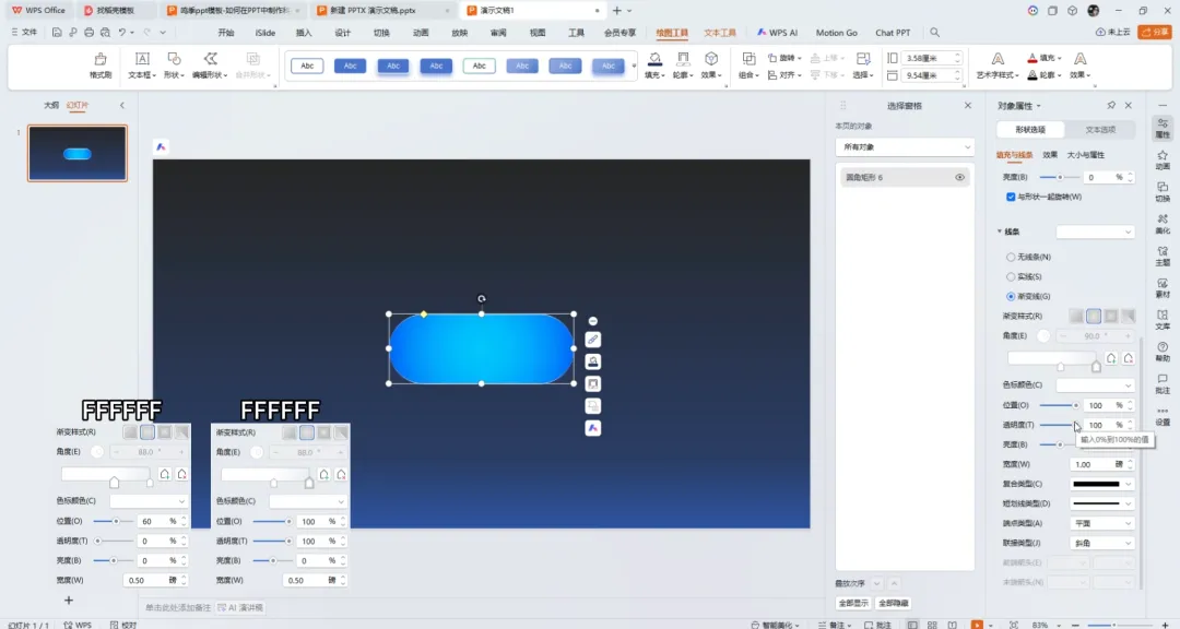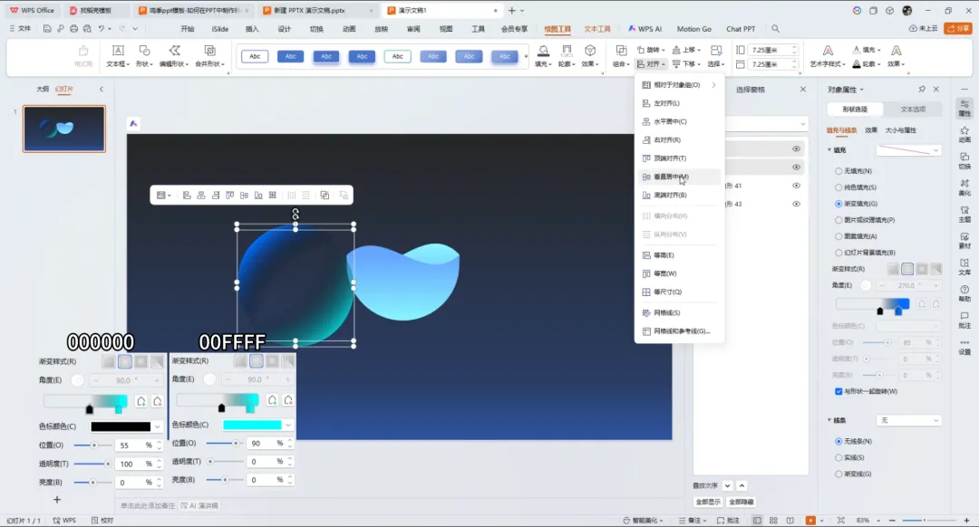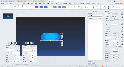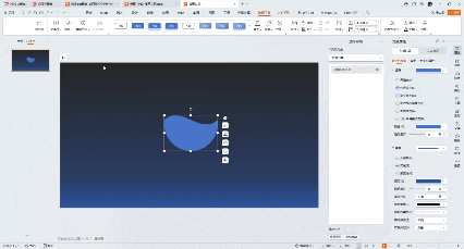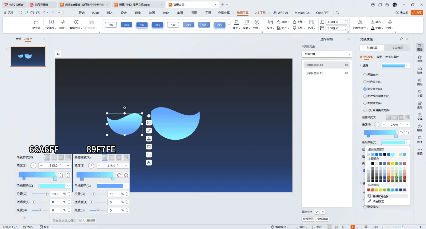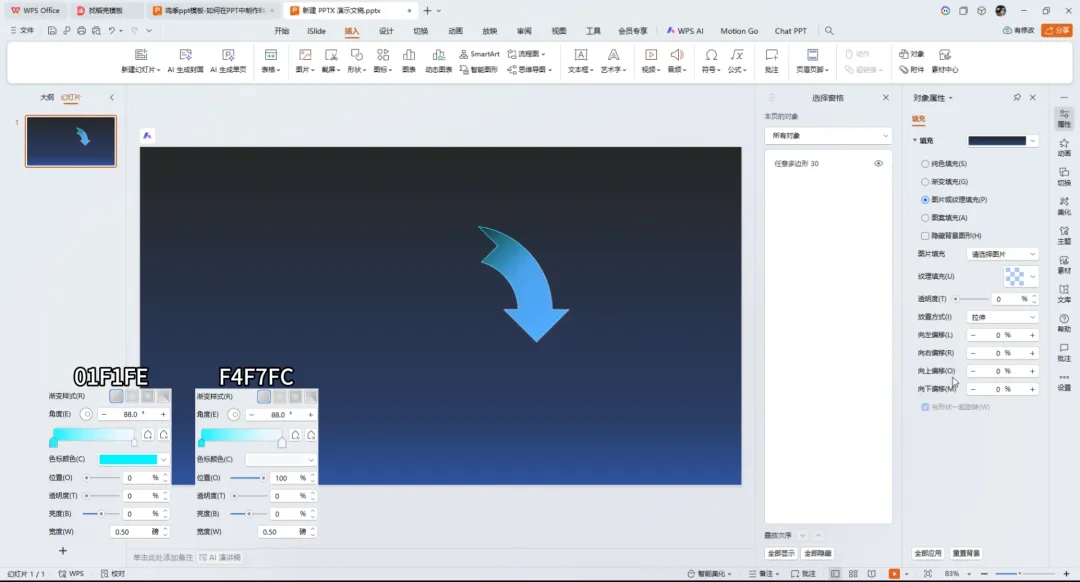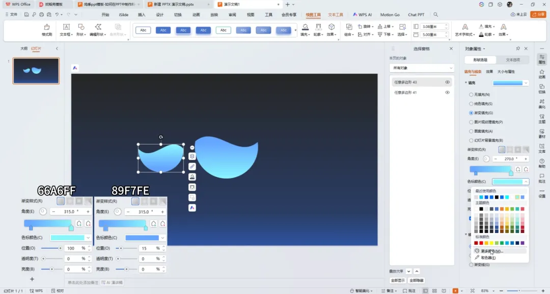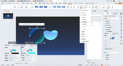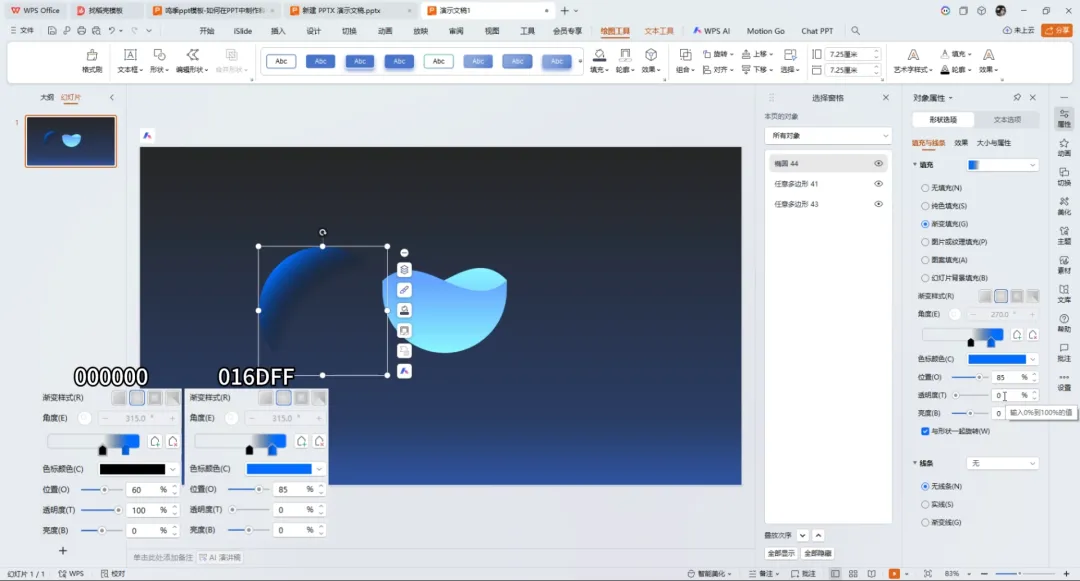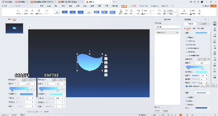 ④插入一个波形,设置无边框颜色并水平翻转,同样插入一个圆形,调整后选中执行【合并形状-相交】,填充渐变色,样式【线性渐变】方向【向上】,两个色标数值如图。