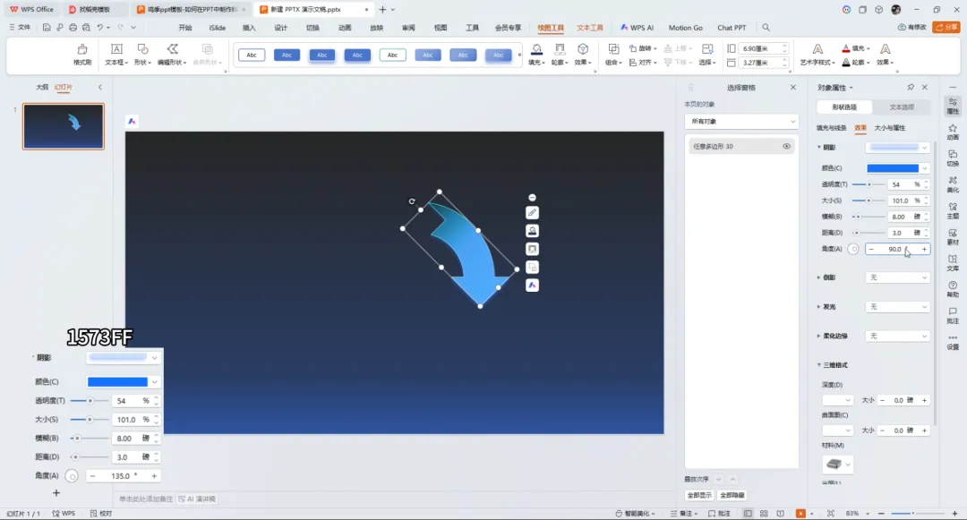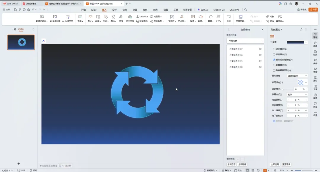 ⑤设置三维格式,材料【标准-塑料效果】光照【中性-对比】,复制三个图形,分别旋转90°180°270°,组合在一起,得到一个科技感循环图。