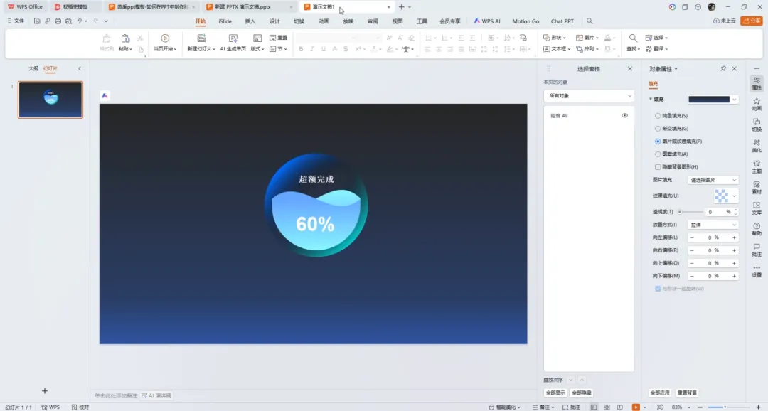 ⑦将圆形组合垫在渐变波形下方,增加文字数值,一个科技感进度球就做好了。