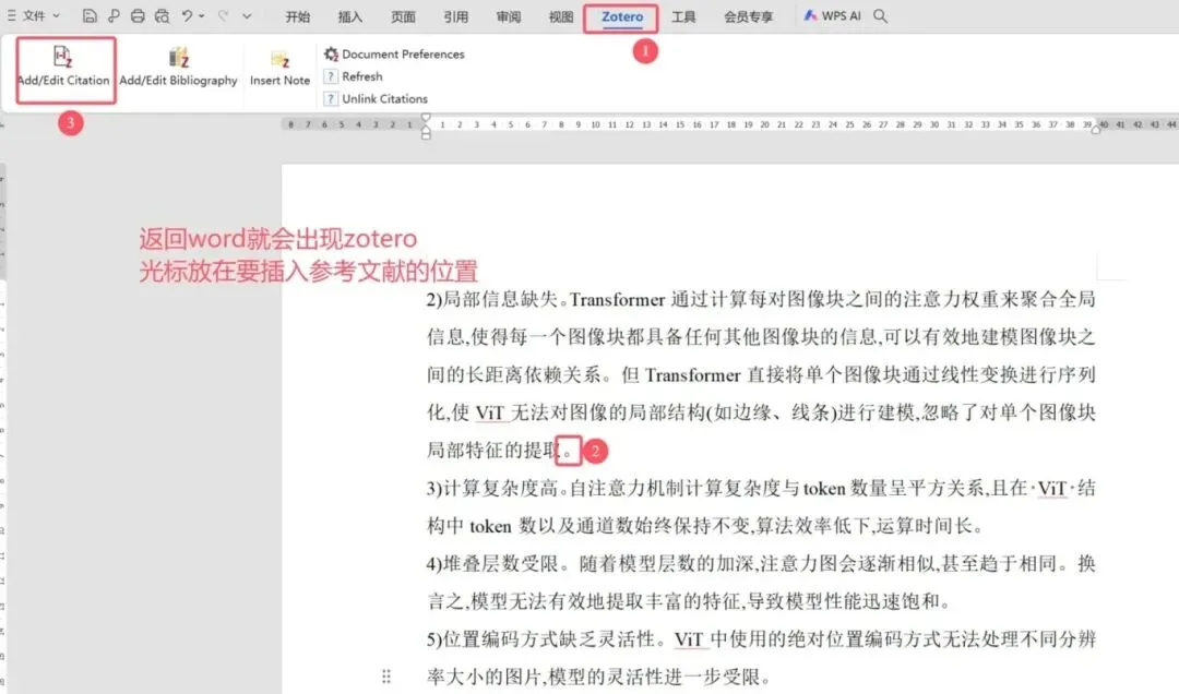 回到 Word,将光标定位到需要插入参考文献的位置。
