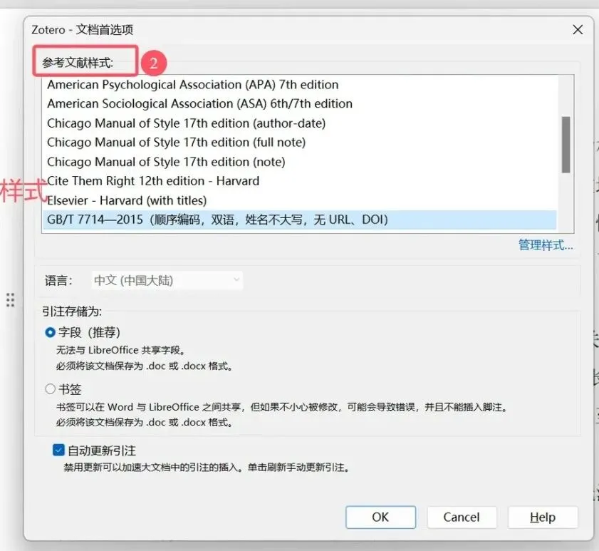 在弹出的 “文档首选项” 窗口中,选择适合的参考文献样式(如 GB/T 7714—2015),点击 “OK” 确认。