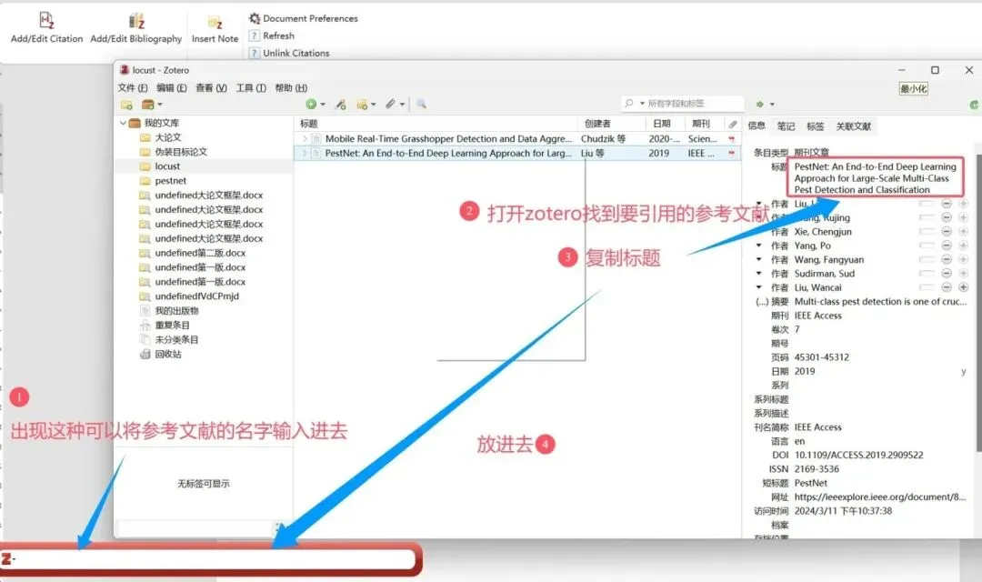 在弹出的检索框中,输入 Zotero 库中目标文献的标题。