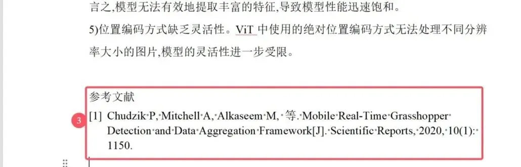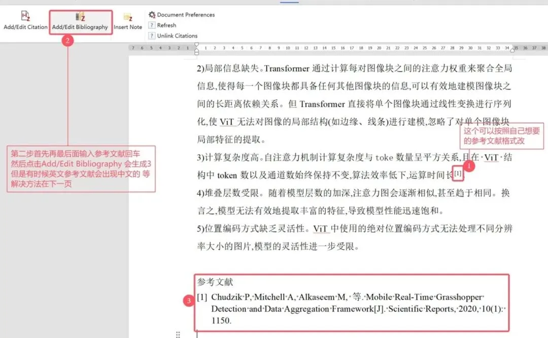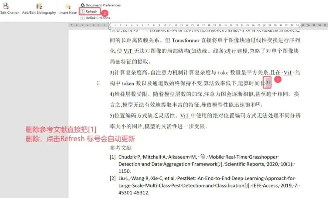 若需删除引用,直接删除正文中的引用标号,再点击「Refresh」,自动更新剩余标号和文献列表。