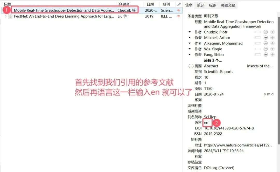 若英文文献后出现 “等” 字,打开 Zotero 客户端,找到对应文献条目。在右侧信息面板的 “语言” 栏输入 “en”。