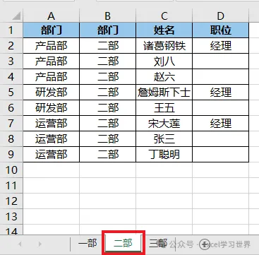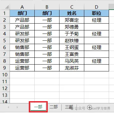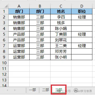 有一个工作簿,如下图 1 至 3 所示,有三个以部门命名的工作表,每个工作表中有一个格式完全一致的数据表。