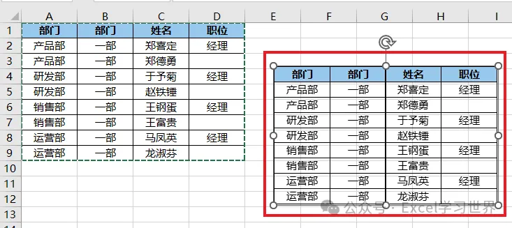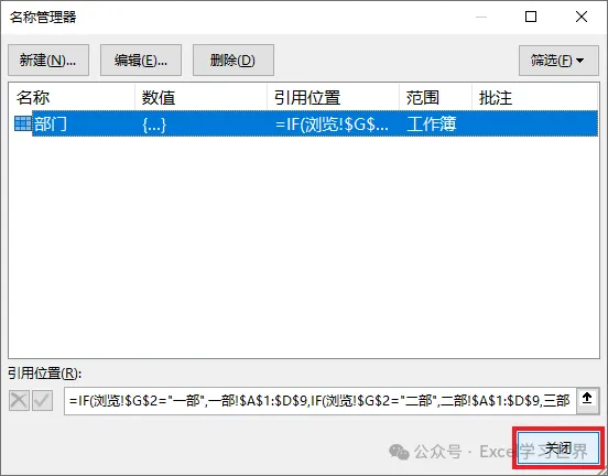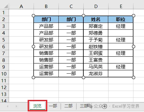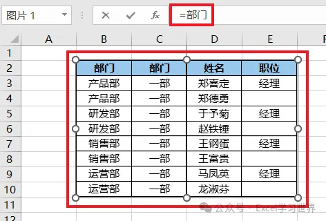 9. 选中“浏览”工作表中的图片 --> 在公式栏中输 =部门