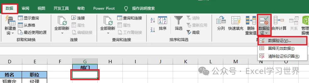 4. 选中 G2 单元格 --> 选择工具栏的“数据”-->“数据验证”-->“数据验证”