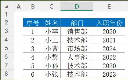 2020:查找值E3:E8:查找区域-1:找小于等于的数-1:从下往上搜索函数结果返回的是5,我们可以看到在区域E3:E8中,入职年限<=2020年,最后一名员工是小孙。