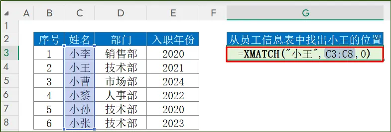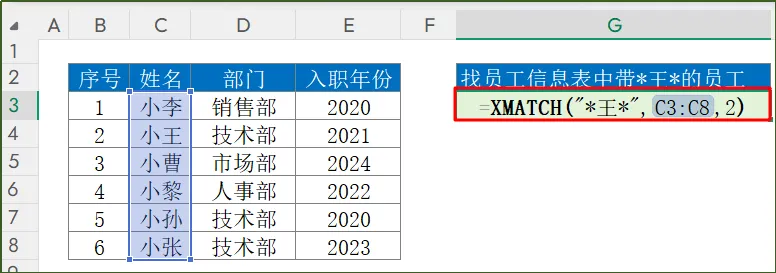 函数公式:"王":含通配符的查找值C3:C8:查找区域2:通配符匹配函数结果返回的是2,我们可以看到在区域C3:C8中含有王的员工是第2个位置。假设我们要查找入职年份≤2020的最后一名员工。