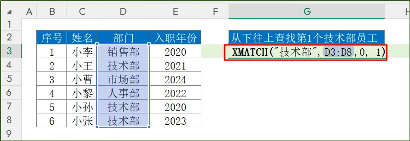 函数公式:=XMATCH("技术部",D3:D8,0,-1)