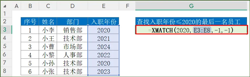 函数公式:=XMATCH(2020,E3:E8,-1,-1)