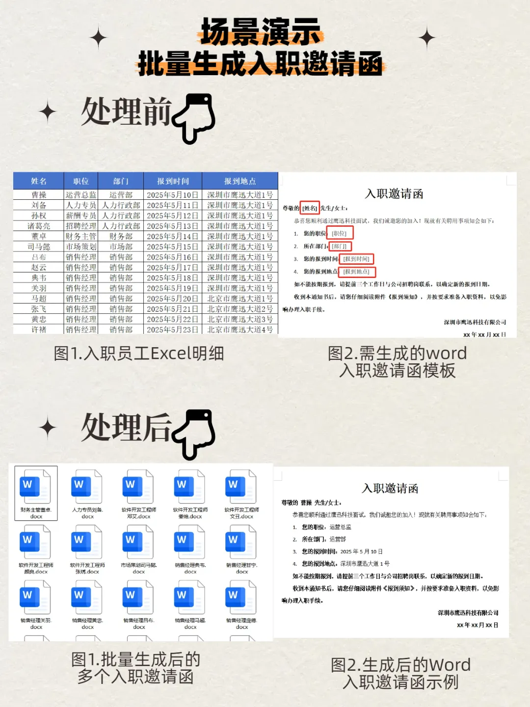 有小伙伴说最近公司要办一个展会,要发放上千份的邀请函,还需要制作大量的工作证。这种工作感觉上很简单,因为每一个工作证和邀请函的模板都是一样的,但是需要动态替换客户的信息。那该如何快速实现这样的效果呢?如果手动一个个地去复制进去的话,天都要塌了。今天就给大家介绍一个方法,我们只需要准备客户的数据信息放在excel表格中,然后就可以批量生成大量的邀请函,工作证等word文档。