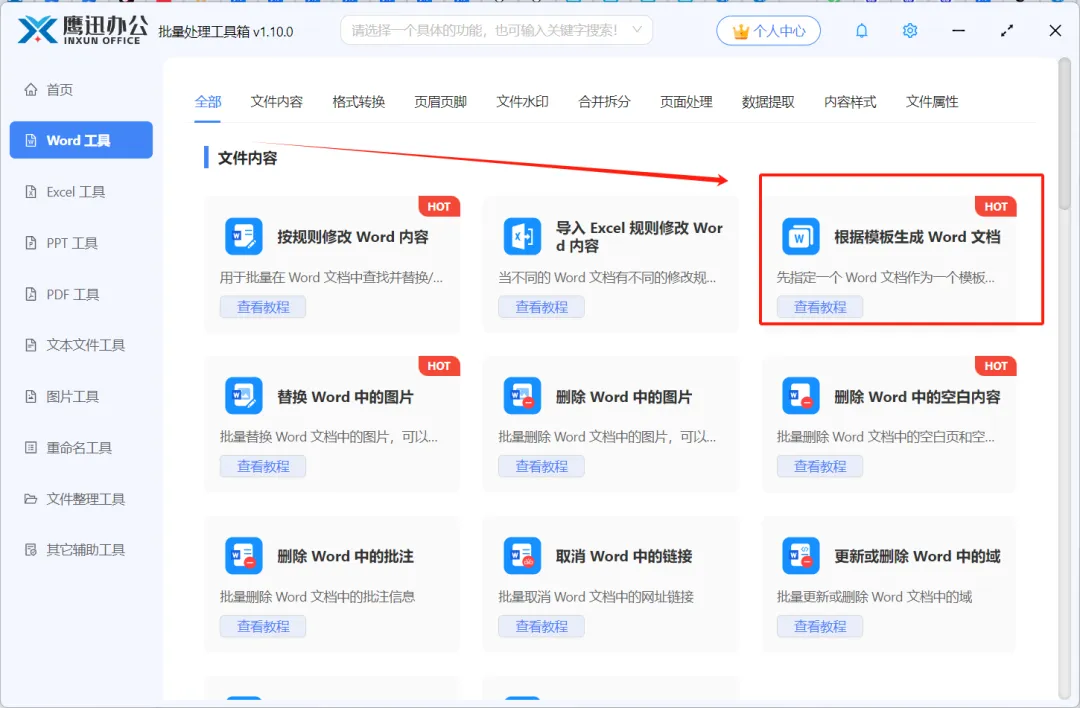 1、打开「鹰迅批量处理工具箱」,左侧选择「Excel 工具」,右侧在文件内容分类中选择「根据模板生成 Excel 文档」的功能。