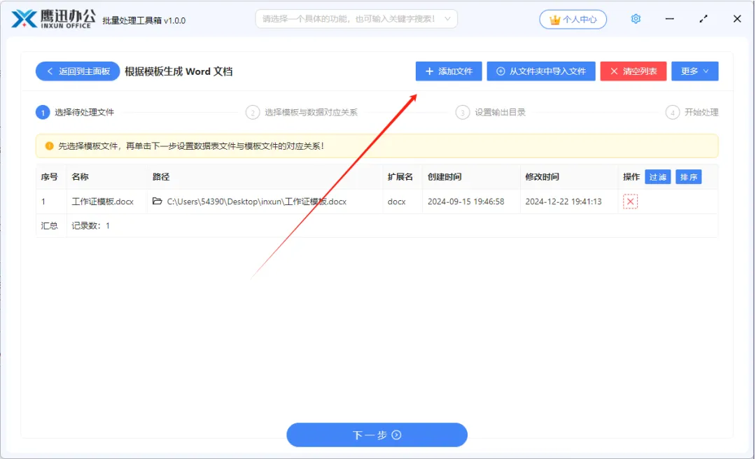 2、选择 Word模板文件。注意这里不是选择员工数据 Excel,而是生成后的word模板文件。