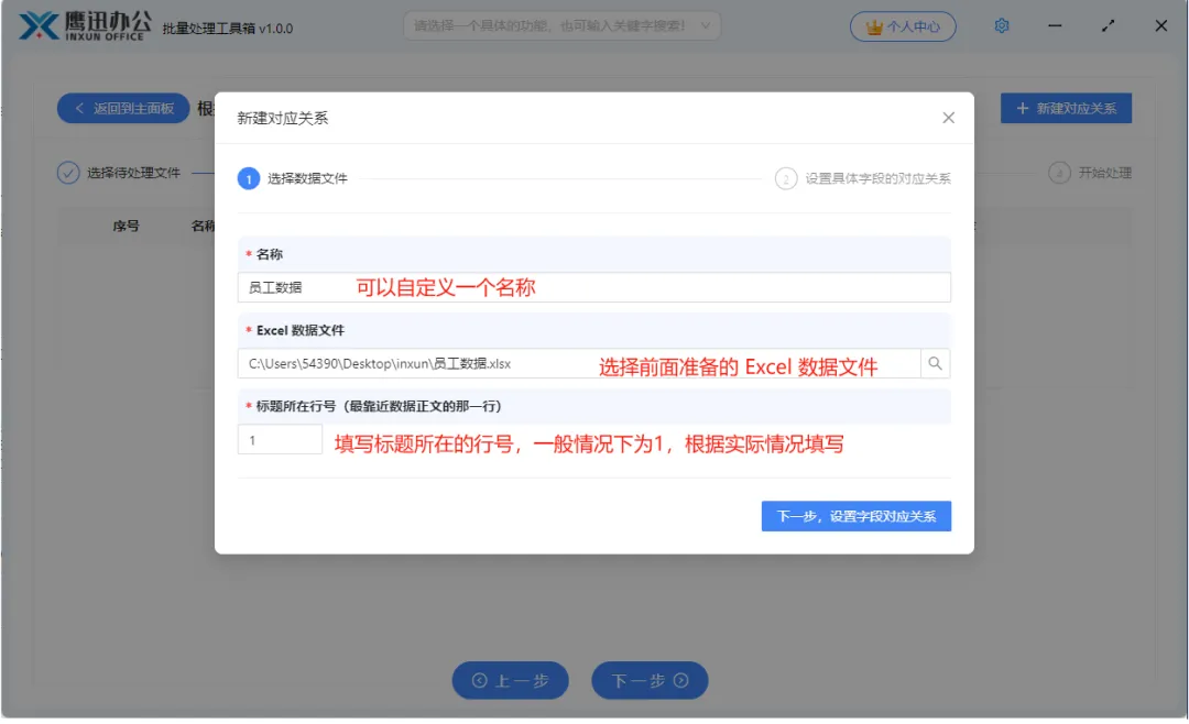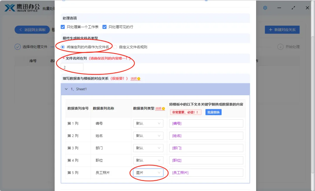 这里需要设置模板中占位符与数据的列的关系了,默认情况下,软件已经自动帮我们建立好了映射关系,如果有不符合要求的可以自行修改。