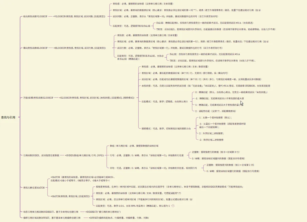 本文总结了在 Excel 数据处理与分析的体系中的常用函数思维导图,这些函数不仅能高效解决单表数据查询、跨表数据匹配、多条件数据提取等基础需求,更能通过嵌套组合实现动态台账引用、数据容错处理、多维数据筛选等高阶应用,尤其在标准化数据管理场景中,能大幅提升数据处理的效率与准确性,让繁琐的人工数据核对、提取工作变得简洁高效,是每一位 Excel 使用者必备的核心技能。