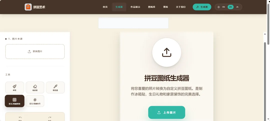 「拼豆艺术」操作简单,不用登录,网址自带中英文模式。