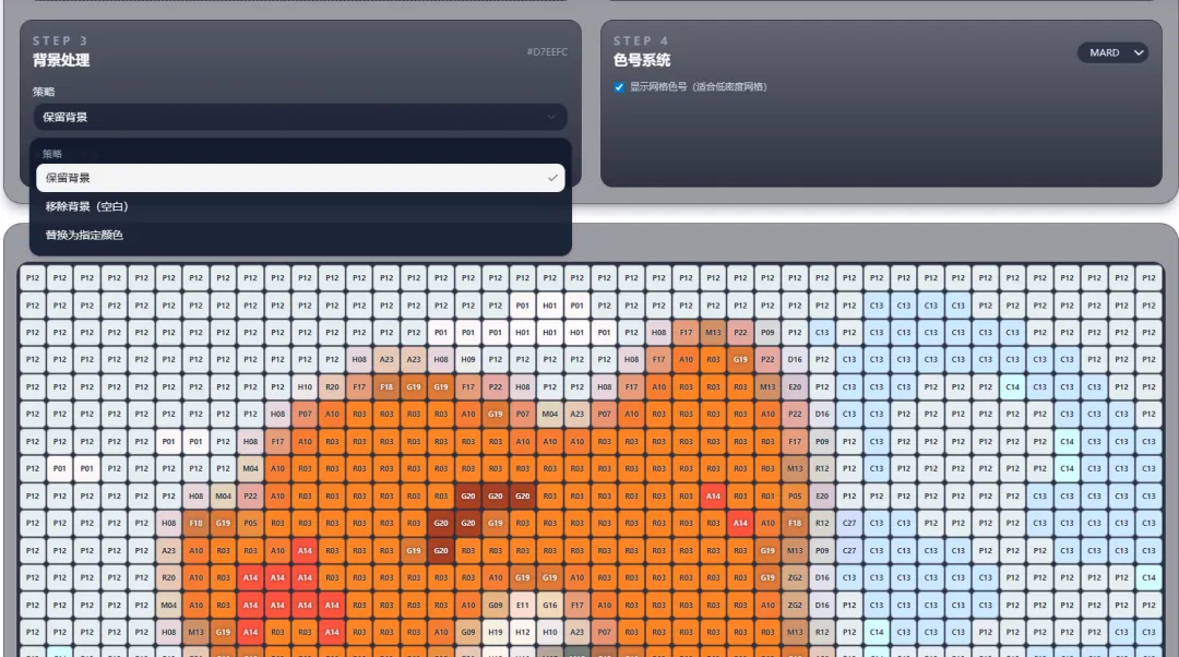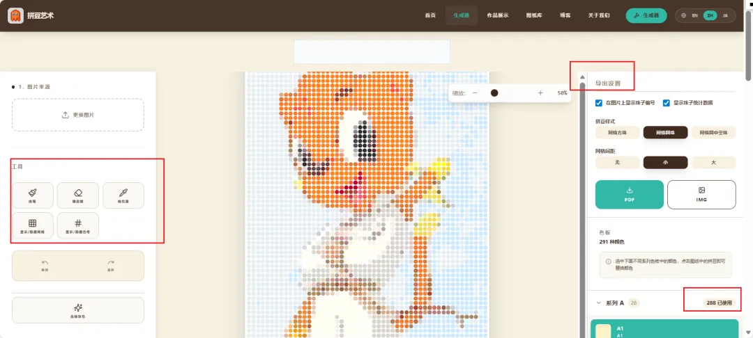 可以看到丰富的设置,如拼豆样式、网格间距、每种色使用的珠子数量等。