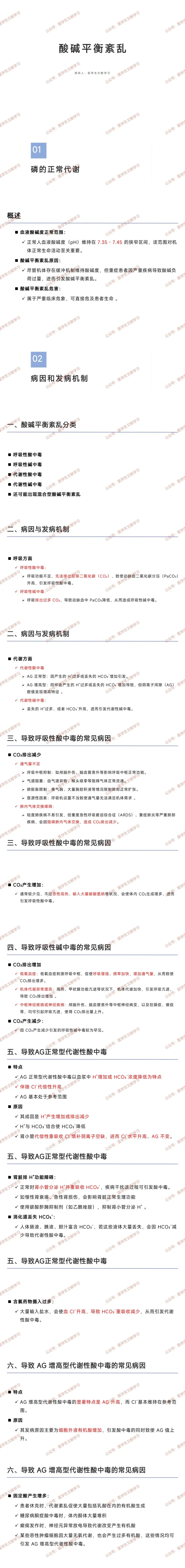 - 相消性混合型:呼吸性与代谢性因素导致的酸碱平衡紊乱不同(如呼酸合并代碱、呼碱合并代酸),可能因两个病因叠加,也可能是机体代偿结果(如 COPD 患者原发呼酸,机体通过代碱代偿维持 pH 稳定)。