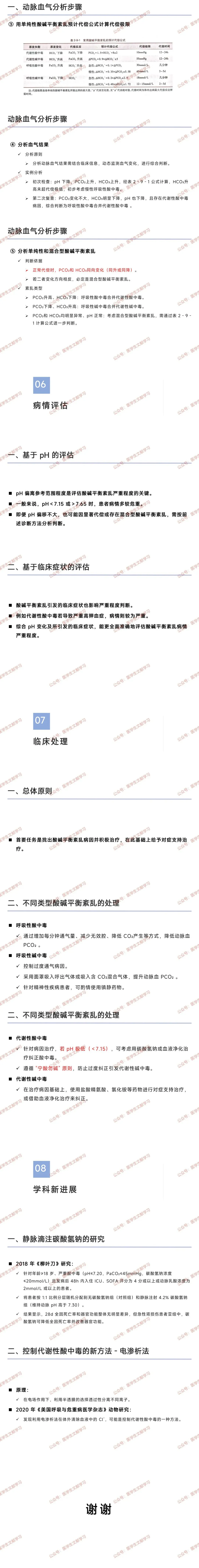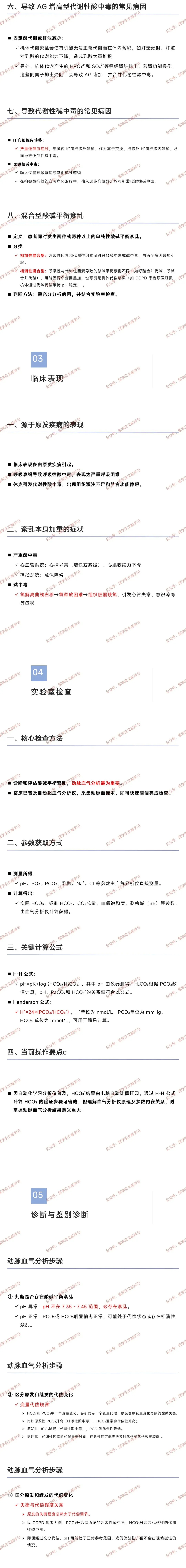 - 实例分析:初次检查 pH 下降、PCO₂上升、HCO₃上升,经公式计算 HCO₃升高未超代偿极值,初步考虑慢性呼吸性酸中毒;第二次复查 PCO₂变化不大、HCO₃明显下降、pH 也下降,且存在代谢性酸中毒病因,综合判断为呼吸性酸中毒合并代谢性酸中毒。
