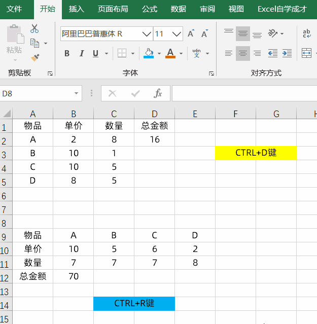 当需要输入公式时,且计算方式一样时,可直接CTRL+C,复制前面的公式,再进行粘贴,即可填充得到结果。