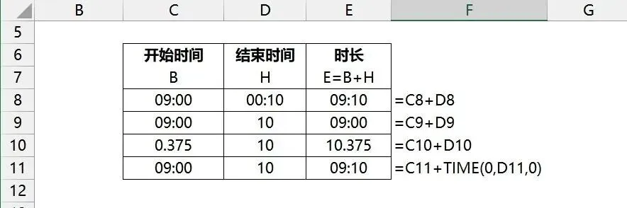 如图,议程通常只要几点几分即可,所以,有关于时长的写法会产生两种操作。当时长的形式是“0:10”时,表示10分钟,结束时间就可以直接做加法;但当时长的形式是“10”时,EXCEL就不明白了,会把开始时间转成小数,得到10.375而不是9:10。所以要强制把时长转成分钟,就用到TIME函数,这个函数有3个参数,分别是小时、分钟和秒,明白了就很好写。