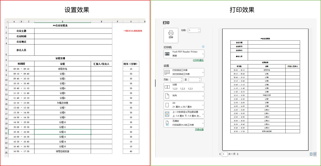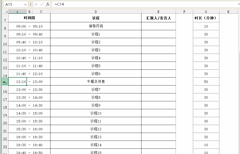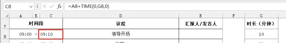 假设议程从第8行开始。调整A到C列列宽,A列放议程开始时间,C列放议程结束时间,B列放个连接符号“-”。在G8放上议程时长(设置在打印区域外,最终不会被打印出来),则C8=A8+TIME(0,G8,0)。