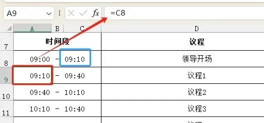 下个议程。结束时间C9公式同上。而开始时间A9实际就是上一个议程的结束时间C8,所以A9的公式为:A9=C8。