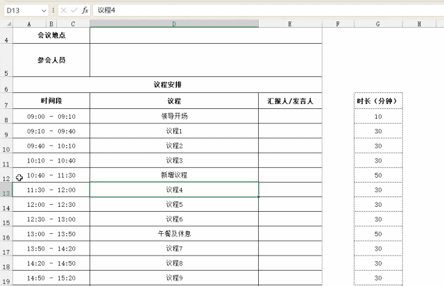 一是新增议程:打算在议程3和4之间新增1个议程。可以随便复制一行议程,插入指定位置后,手动调整下一行的开始时间公式就行了。