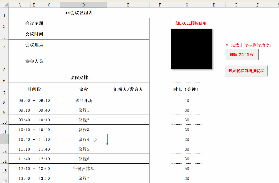 如果还是嫌麻烦,可以点击转到下篇付费文章《EXCEL快速调整会议议程时间【一键操作-省心版】》,只需一杯咖啡不到的价格,获取代码加持的省心版文件,上述新增和删除议程的操作都可以一键操作: