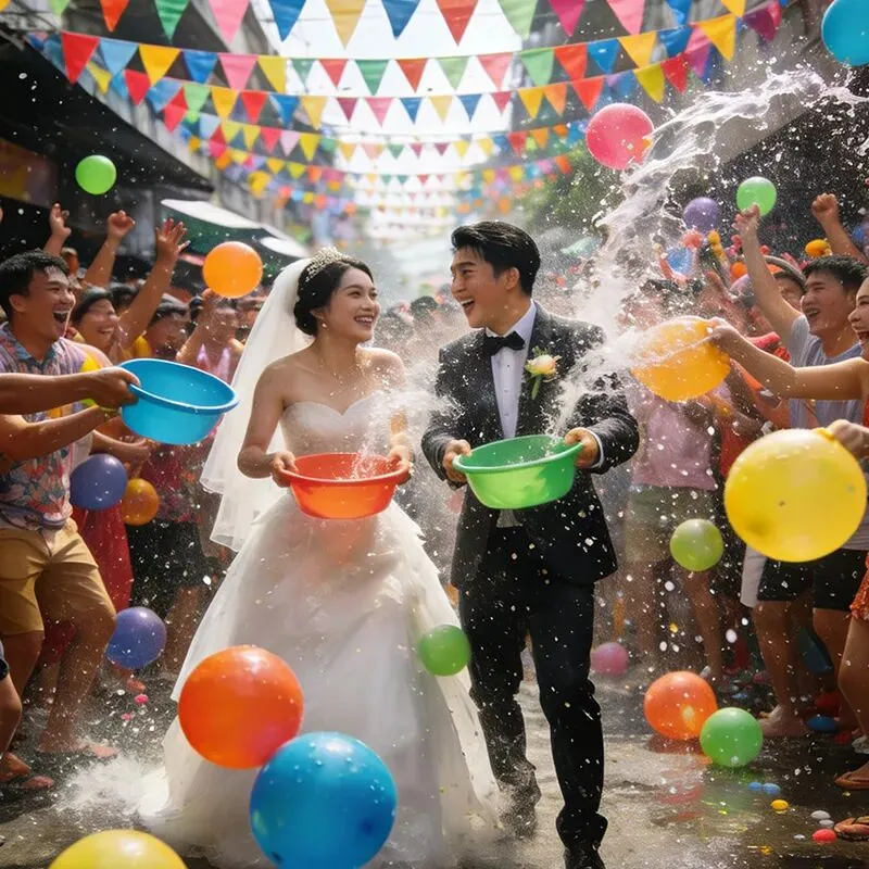 于是,我用 AI 把我们的结婚照 P 成了泼水节的狂欢场景,发给老公说:“你看,我们这不是‘泼出去的水’,我们这是在泼水节嗨皮呢!”