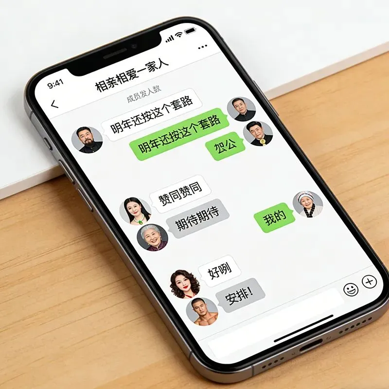 最后,给大家看一下家族群的最新消息。昨天,我爸在群里发了一个 “明年继续这个套路” 的表情包,我妈、公公婆婆纷纷点赞。