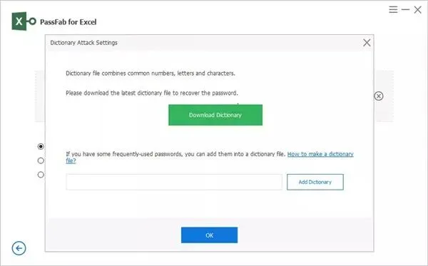 首先,您应该了解 3 种密码恢复模式,即字典攻击、带掩码的暴力破解和暴力攻击。字典攻击带有面具攻击的暴力破解蛮力攻击字典攻击 何时使用:如果您知道自己曾经使用过哪些密码,并且可能是您的Excel文件密码,那么请将它们放入txt文件中并将其导入到我们的软件中,它会自动找出正确的密码。如果您对此类文件不了解,该程序为您提供最新的密码字典。工作原理:当您选择此类型时,只要单击“设置”选项,您就可以下载我们软件构建的最新密码字典。您可以将所有可能的密码放在一个文本文档中,将该文档插入到 PassFab for Excel 中,然后运行该软件,它会找回您的密码。否则,它将从内置字典中恢复密码。